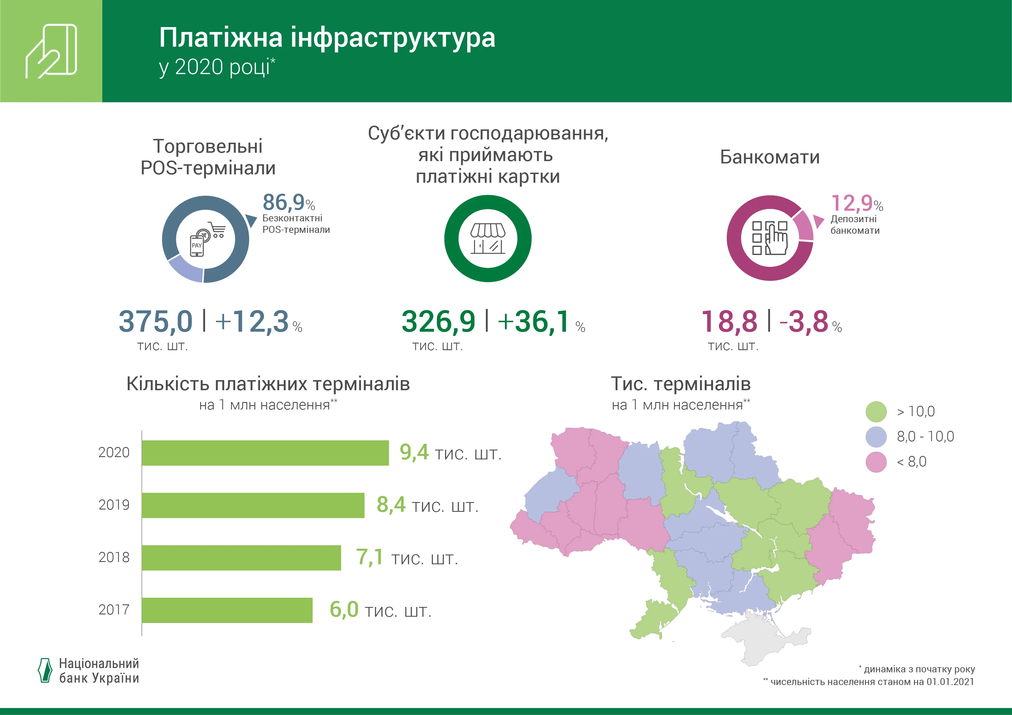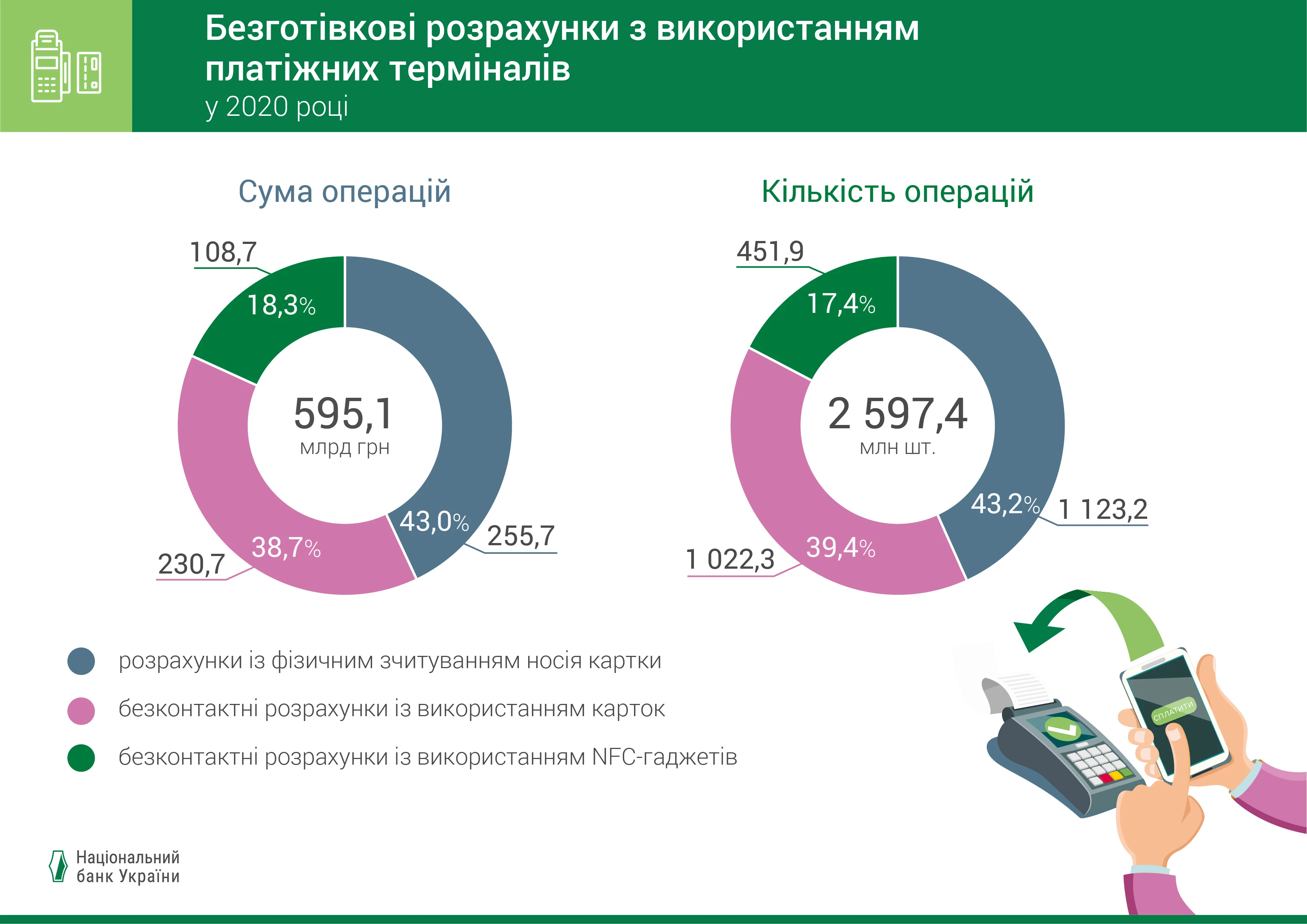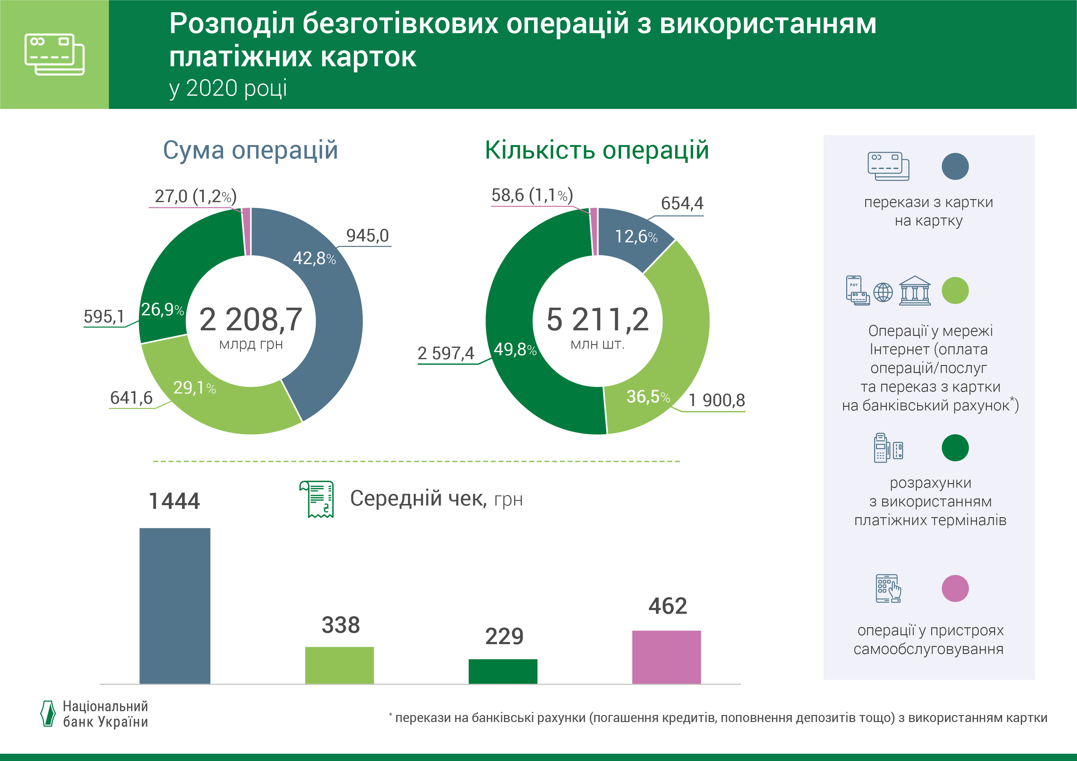 Пять лет назад эти показатели были существенно ниже – 70% и 35% соответственно. По сравнению с 2019 годом в 2020 году количество безналичных операций с использованием платежных карт увеличилось на 25% и составило 5211,2 млн, а их сума выросла почти на 23% и превысила 2 208,7 млрд грн. При этом уменьшились количество и сумма операций получения наличных – на 11,7% и 1,7% соответственно. В 2020 году менялись платежные привычки держателей банковских карт. Так, средняя сумма операции перевода с карты на карту за год уменьшилась на 10,3% до 1444 грн; средняя сумма операции в платежных терминалах (POS-терминалах) снизилась на 5% до 229 грн. Держатели платежных карт стали охотнее и чаще использовать их для небольших покупок в магазинах или операций по переводу средств. В то же время средняя сумма операции в Интернете выросла до 338 грн. Сумма операций в Интернете росла в 2020 году наибольшими темпами (произошел рост на 31% по сравнению с 2019 годом). Каждая третья (36,5%) безналичная операция по платежной карте в 2020 году осуществлялась в сети Интернет. Это почти 642 млрд грн за 2020 год. Половина всех безналичных операций с использованием платежных карт (49,8%) осуществлялась в платежных терминалах. Их сумма составила четверть от суммы всех безналичных операций (26,9%). Если в 2019 году это было 513 млрд грн, то в 2020 году – 595 млрд грн (рост на 16% по сравнению с 2019 годом). В 2020 году наибольшую долю в общей сумме безналичных операций с использованием платежных карт (как и в прошлом и позапрошлом годах) составили переводы с карты на карту (42,8%), хотя по количеству операций их доля лишь 12,6%. За год сумма переводов с карты на карту выросла почти на четверть (24%) до 945 млрд грн. Однако этот рост в три раза меньше, чем в прошлом году (в 2019 году произошел рост на 64% по сравнению с 2018 годом). Половина операций в POS-терминалах – бесконтактные За 2020 год общее количество платежных карт в Украине выросло на 8% и составило 73,4 млн шт. Из них 55,1% (40,4 млн шт.) использовались в декабре 2020 года для осуществления расходных операций (активные карты). В течение всего прошлого года всё больше людей предпочитали использовать бесконтактные карты, а также смартфоны и другие NFC-устройства для осуществления бесконтактных платежей. Это обусловлено высоким уровнем безопасности, скоростью и удобством таких операций. За 2020 год количество бесконтактных карт, которые использовались для осуществления операций, выросло больше чем на половину – до 13,2 млн шт. В торговых платежных терминалах 57% операций по сумме и по количеству осуществлялись бесконтактно. В то же время почти каждая пятая операция в торговых сетях происходила с помощью смартфонов и других гаджетов (так в 2020 году было потрачено почти 109 млрд грн). Платежная инфраструктура продолжает расти Несмотря на карантинные ограничения, за прошлый год платежная инфраструктура существенно расширилась. Количество субъектов хозяйствования, которые принимают платежные карты, за год выросла более чем на треть (36,1%) до 326,9 тыс. Сеть торговых POS-терминалов в Украине за год выросла более чем 12% до 375 тыс. При этом почти 87% торговых платежных терминалов обеспечивают возможность осуществления бесконтактной оплаты. За последние пять лет количество торговых платежных терминалов увеличилось почти вдвое - с 199,8 тыс. до 375,0 тыс. ед. Количество платежных терминалов (контактных и бесконтактных) в расчете на 